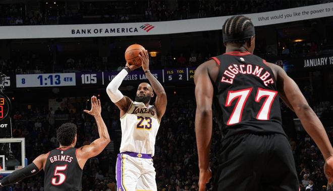 湖人的反扑浪潮始于詹姆斯,他连进两记中投得分,接着投进一记三分球,帮助湖人将比分追到62比63。
