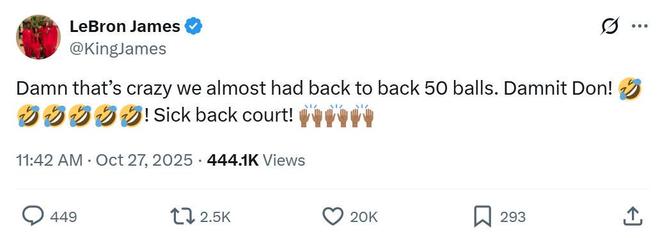 期间还不忘调侃前一场错失50+的东契奇,詹姆斯写道:“太疯狂了,我们的后场双人组差一点就拿下连场50+,都怪你东契奇,我们的后场双人组太棒了!”