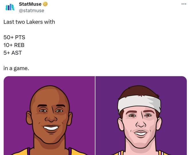 第三项:湖人队史第三位单场至少拿到50分10板5助的球员,前两人是埃尔金贝勒和科比。
